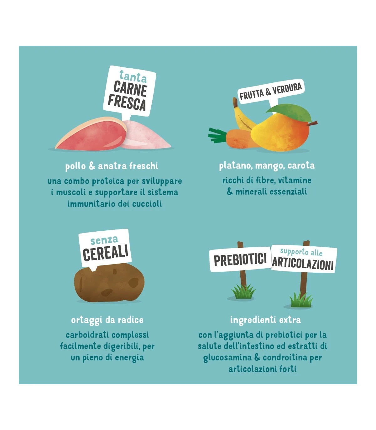 Questa ricetta senza cereali è realizzata con tanta carne fresca di pollo e anatra allevati a terra ed è pensata per soddisfare i bisogni nutritivi dei cani cuccioli in crescita.