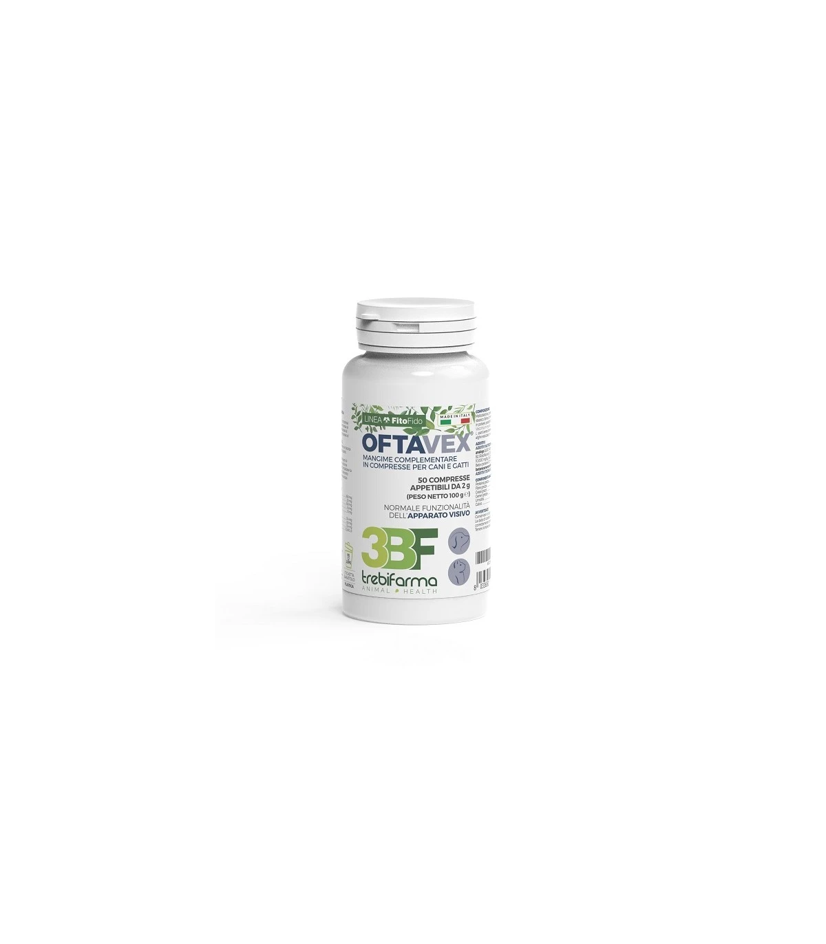 Trebifarma oftavex 50 compresse 2 gr è un mangime complementare in compresse per cani e gatti indicato per favorire la normale funzionalita’ dell’ apparato visivo.